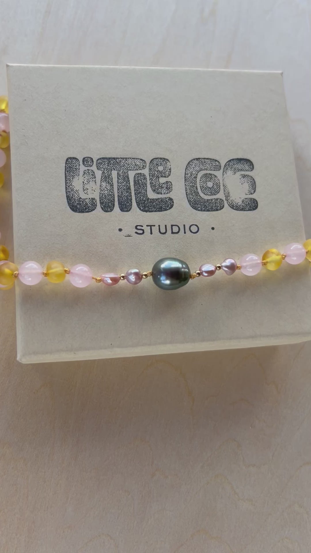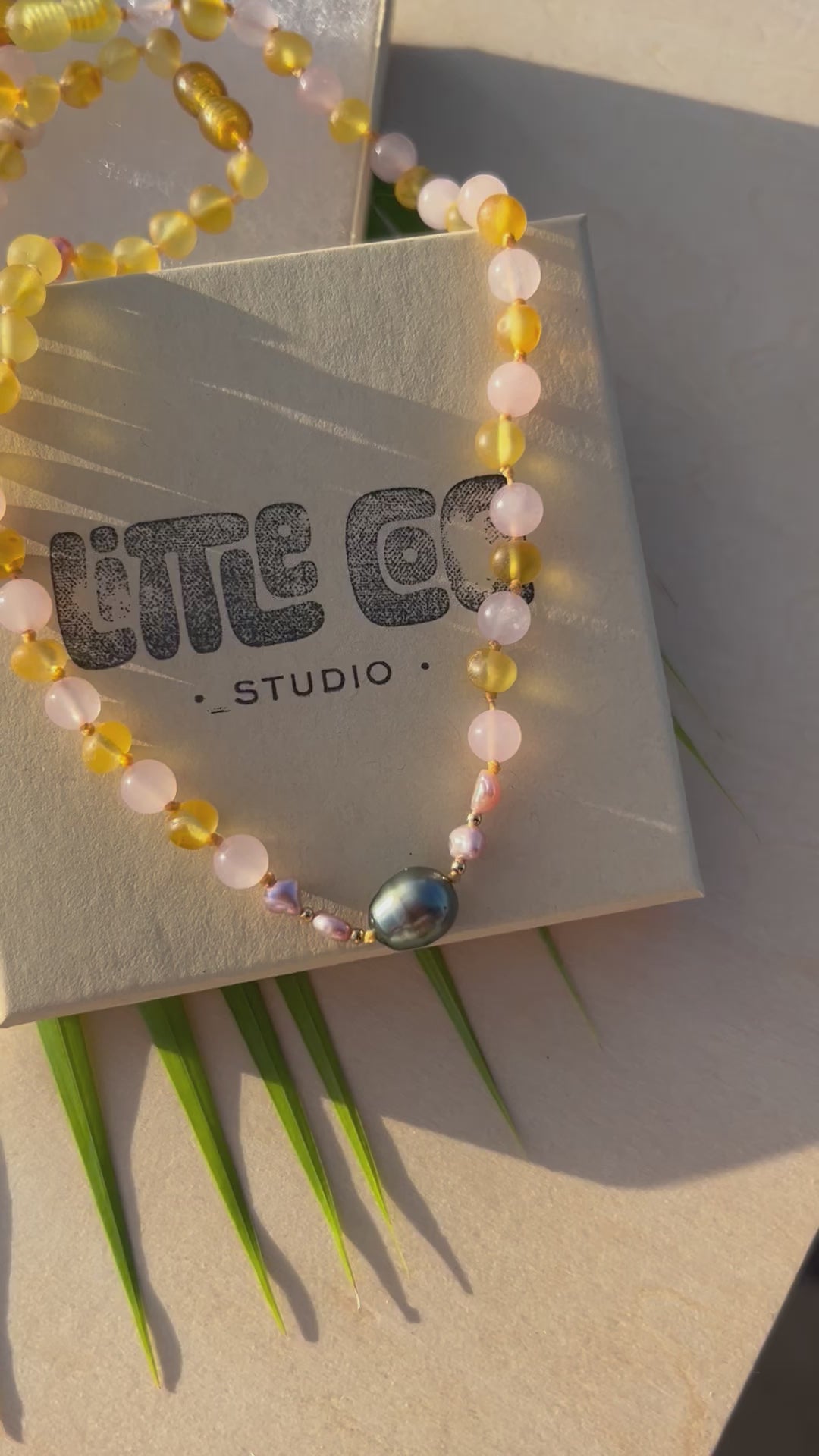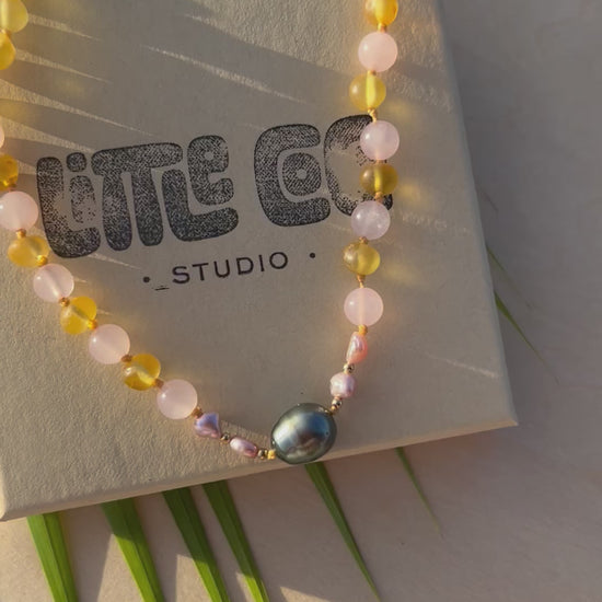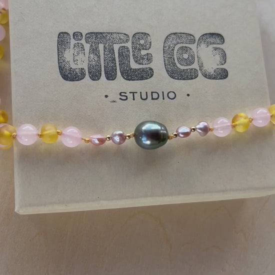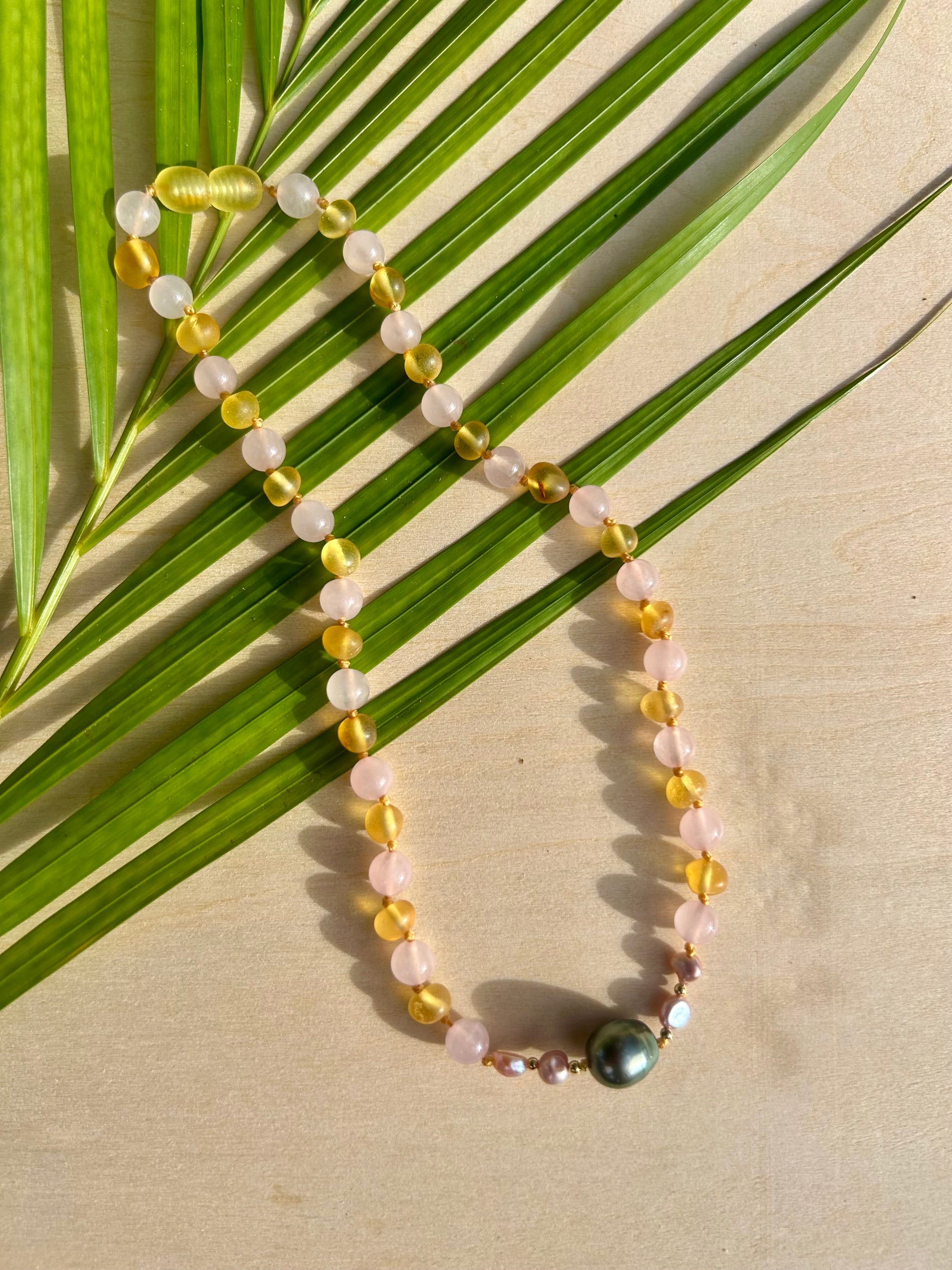 ~Hand knotted with raw (lemon color) amber & rose quartz. Centered with a 9mm Tahitian pearl and pink mini freshwater pearls. Spacer beads featured are 14k gold filled. Item is finished with a screw clasp that's simple to open and close while keeping it safely fastened.
