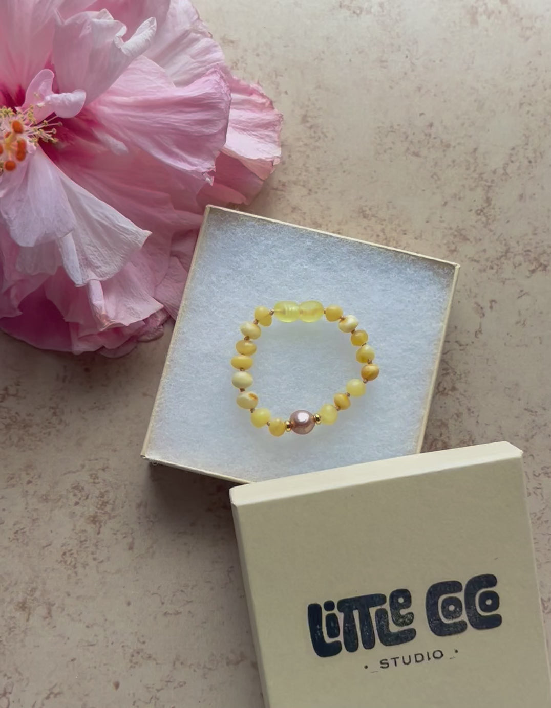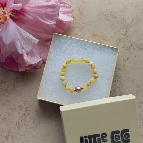 ~Hand knotted polished (Milky yellow) colored amber infant bracelet. Featuring a pink Edison pearl with gold filled spacers. Item is finished with a screw clasp that's simple to open and close while keeping it safely fastened.